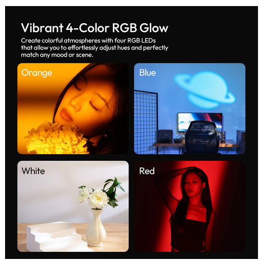 Farbsteuerung: RGB-LEDs (orange, blau, weiß, rot) für unterschiedliche Stimmungen und Umgebungen.