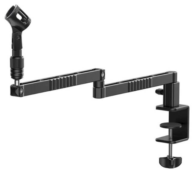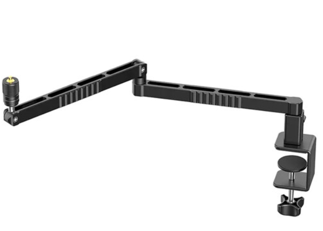 Der Ulanzi LS26 Low-Profile Extendable Microphone Arm ist ein schlanker, schwarzer Aluminium-Ausleger, der für ungehinderte Live-Streaming-, Rundfunk- und Karaoke-Setups entwickelt wurde und mit einer Gesamtlänge von 18,9 Zoll, einer Armlänge von 14,5 Zoll und einer Verlängerung von 9,8 Zoll eine großzügige Reichweite für eine flexible Positionierung bietet. Sein zweistufiges Gelenkdesign ermöglicht eine vertikale Neigung von 180° und eine horizontale Drehung von bis zu 360° sowie eine Schwenkbarkeit des Mikrofonhalters um 300°, alles gesichert durch intuitive Schraubknopfverstellungen, während die C-Klemmenbasis Tische mit einer Dicke von bis zu 2" mit rutschfester Polsterung für felsenfeste Stabilität festhält. Mit einer abnehmbaren 1/4"-20-Gewindeklemme (mit 3/8"-16- und 5/8"-Adaptern im Lieferumfang) kann es Mikrofone mit einem Gewicht von bis zu 2,2 lb tragen und sorgt für eine klare Sicht auf Gäste oder Monitore ohne lästiges Kabelmanagement. Mit einem Gewicht von nur 2,2 lb lässt es sich leicht aufstellen.