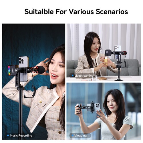 Mit mehreren Befestigungspunkten – darunter Kaltschuhe, 1/4"-20-Gewinde, ein 3/8"-16-Gewinde und eine ARRI-Positionierungsbohrung – fungiert das MA53 als kompakter mobiler Rig-Hub für Mikrofone, LED-Leuchten, Monitore oder drahtlose Empfänger. Ob Sie nun vloggen, Social-Media-Inhalte aufnehmen oder live streamen – das MA53 ist eine leistungsstarke und vielseitige Smartphone-Befestigungslösung.