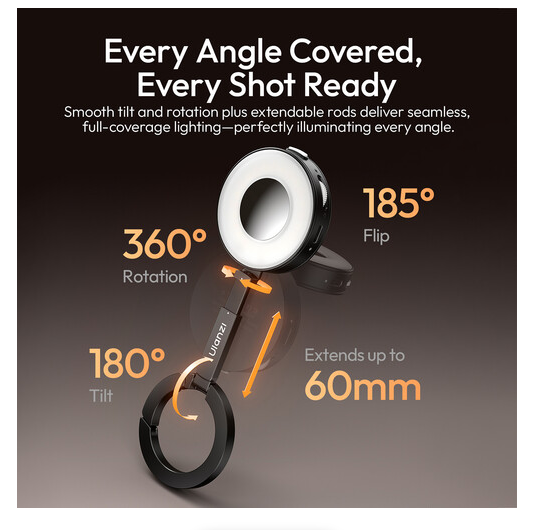 Das Ulanzi ML05 MagLock Fill Light ist das ultimative Werkzeug zur Verbesserung der Smartphone-Fotografie, des Vloggens und der Erstellung von Inhalten. Sein kompaktes Design lässt sich magnetisch an jedem MagSafe-kompatiblen Gerät oder Gehäuse befestigen, während eine integrierte ausziehbare Stange es Ihnen ermöglicht, es zu neigen, zu drehen oder als Ständer oder Griff zu verwenden, um die Ergonomie zu verbessern.