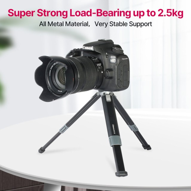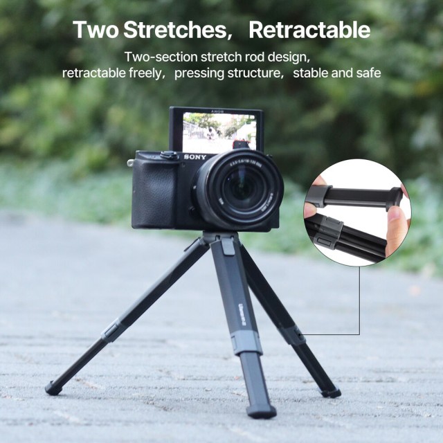 Das Ulanzi MT-22 ist ein kompaktes Mini-Stativ aus Metall mit einer 1/4"-20-Halterung, das bis zu 2,5 kg tragen kann. Seine zweiteiligen Push-Pull-Beine ermöglichen einen schnellen Aufbau, einstellbare Winkel und Aufnahmen aus niedriger Perspektive, wodurch es sich perfekt für Actionkameras, kompakte spiegellose Kameras oder Webcams eignet.