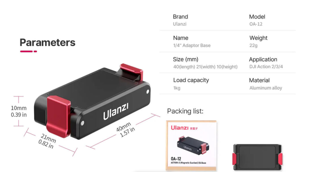 Ulanzi OA-12 Magnetic Suction 1/4 Base For DJI Action 2/3/4 V2