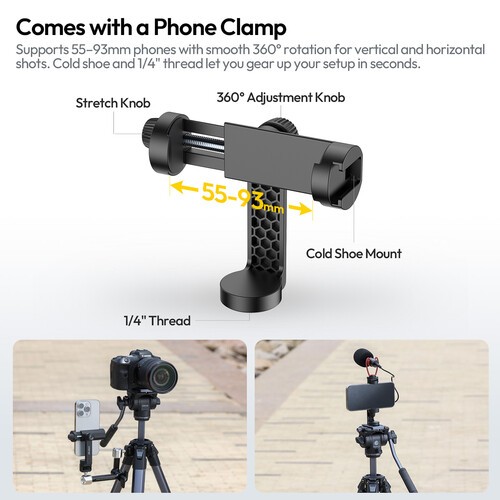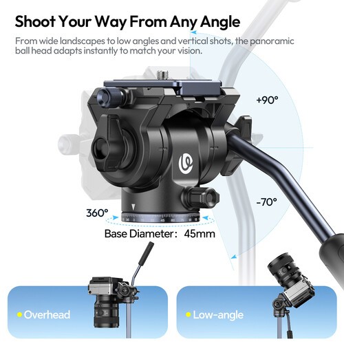 Das Ombra Video II XIANG Aluminiumstativ mit Fluidkopf von Ulanzi ist ein leichtes Stativ für Videoaufnahmen unterwegs. Mit einem Fluidkopf mit einer Tragkraft von 3 kg, 360° Schwenkbereich und +90/-75° Neigung lässt sich Ihre Kamera ganz einfach auf der mitgelieferten Arca-Schnellwechselplatte befestigen und die perfekte Aufnahme einrichten. Die fünfteiligen Beine haben eine Tragkraft von 10 kg und bringen die Kamera bei vollständig ausgefahrener Mittelsäule auf eine Höhe von 157 cm. Für Stabilität sorgen die Stachelfüße und ein Gegengewicht an der Mittelsäule, das für niedrige Winkel auch umgedreht werden kann. Das Stativ lässt sich auf eine Länge von nur 49 cm zusammenklappen und verfügt sowohl über eine 1/4"-20-ARRI-Befestigungsbohrung als auch über eine Handyklemme für die Montage von zusätzlichem Zubehör.