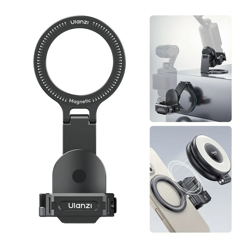 Schöpfen Sie das volle Potenzial Ihres Pocket3 aus – mit der Ulanzi PM01 MagSafe-Erweiterungshalterung, einer flexiblen und kompakten Befestigungslösung für MagSafe-fähige Smartphones oder Telefone mit Magnetringen. Das doppelseitige Magnetdesign hält Ihr Telefon und kompatibles Zubehör sicher fest, während Bedienelemente, Joysticks und Anschlüsse vollständig zugänglich bleiben. Die robuste Konstruktion aus Aluminiumlegierung und Silikon trägt bis zu 500 g, während das faltbare Design eine einfache Aufbewahrung und Mitnahme auf Reisen ermöglicht. Die Halterung ist mit einem Blitzschuh, einem 1/4"-Gewinde, einer Action-Halterung und ARRI-Löchern für die vielseitige Befestigung von Zubehör ausgestattet. Dank der stufenlosen Winkelverstellung können Sie Ihr Gerät perfekt für Flat-Lay-Fotografie, Streaming, Gaming oder freihändiges Betrachten positionieren.