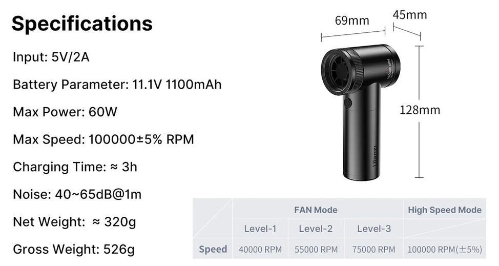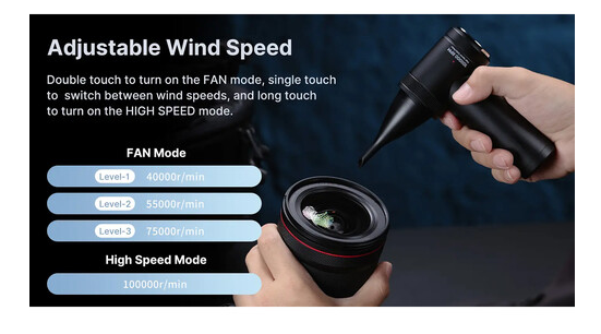 Ausgestattet mit vier einstellbaren Geschwindigkeitsstufen ermöglicht der Luftreiniger eine präzise Steuerung für verschiedene Reinigungsaufgaben – von empfindlicher Kameraausrüstung bis hin zu Tastaturen, PC-Komponenten und Schreibtischausstattungen. Der leistungsstarke Motor liefert Drehzahlen von 40.000 bis 100.000 U/min und sorgt so für eine effektive Reinigungsleistung.