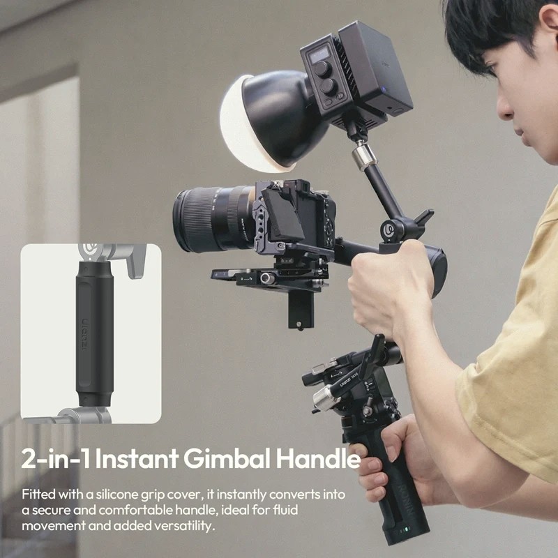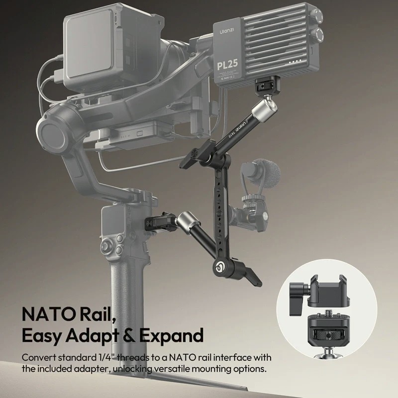Ein herausragendes Merkmal ist das 2-in-1-Gimbal-Griffdesign. Mit der mitgelieferten Silikon-Griffabdeckung lässt sich der Arm im Handumdrehen in einen komfortablen Handgriff verwandeln, der für sanfte Bewegungen und dynamische Aufnahmen sorgt. Für erweiterte Rigging-Optionen verfügt das doppelseitige Multi-Slot-Design über ¼"-20-Gewinde, ein ⅜"-16-Gewinde, ARRI-Fixierstifte und eine NATO-Schiene, die eine sichere, verdrehsichere Befestigung gewährleisten.
