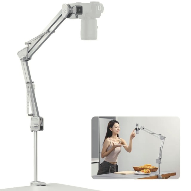 Die Ulanzi TH04 Overhead-Kamerahalterung wurde entwickelt, um Creators, Streamern und Pädagogen stabile, professionell aussehende Aufnahmen von oben zu ermöglichen. Mit ihrem robusten Metallarm und einer empfohlenen Tragkraft von bis zu 2 kg hält sie Kameras, Smartphones, Mikrofone und anderes Zubehör sicher und ohne Durchhängen. Das federbelastete Verstellsystem ermöglicht eine schnelle und präzise Positionierung, sodass sich der Winkel während der Aufnahmen leicht feinjustieren lässt.