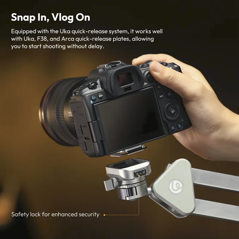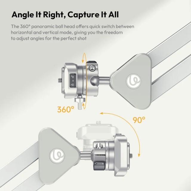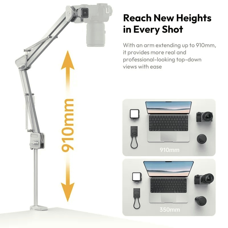 Ausgestattet mit dem Uka-Schnellwechselsystem ist die TH04 mit Schnellwechselplatten vom Typ Uka, F38 und Arca kompatibel, was eine schnelle Einrichtung und einen nahtlosen Gerätewechsel ermöglicht. Der Arm lässt sich bis zu 910 mm ausfahren und bietet so eine echte Perspektive von oben, die sich ideal für Tutorials, Unboxings, Kochvideos und Tischaufnahmen eignet. Das klappbare, abnehmbare Armdesign spart Platz und verbessert die Tragbarkeit, während die 68-mm-C-Klemme einen starken, zuverlässigen Halt auf den meisten Schreibtischen und Tischen gewährleistet. Ob im Studio oder vor Ort – der TH04 vereint Flexibilität, Stabilität und Effizienz in einer kompakten Überkopf-Befestigungslösung.