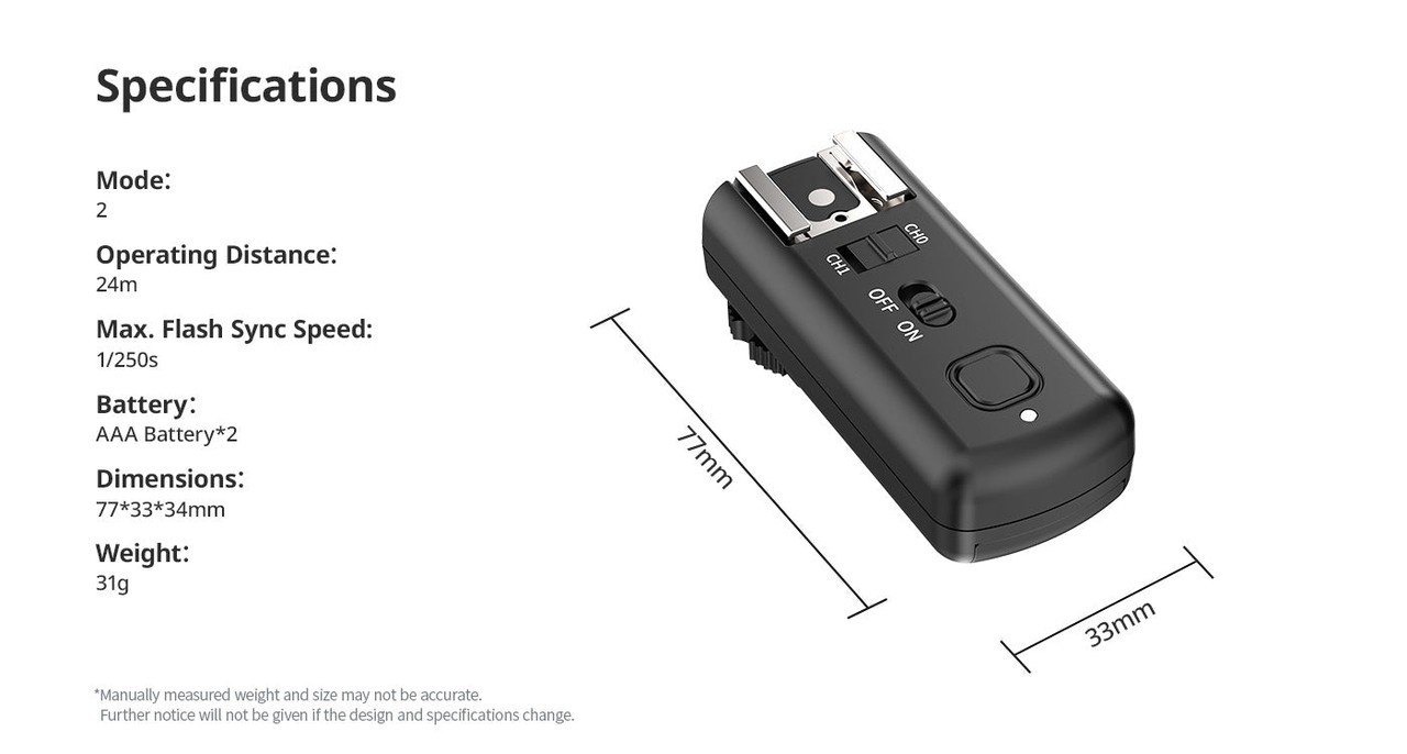 Mit einem Gewicht von nur 31 g ist der TT-01 leicht und passt in jede Tasche. Damit eignet er sich perfekt für Aufnahmen unterwegs, egal ob im Studio oder vor Ort. Mit einer maximalen Blitzsynchronisationsgeschwindigkeit von 1/250 s liefert er zuverlässige Leistung für Porträts, Veranstaltungen und kreative Beleuchtungskonfigurationen.