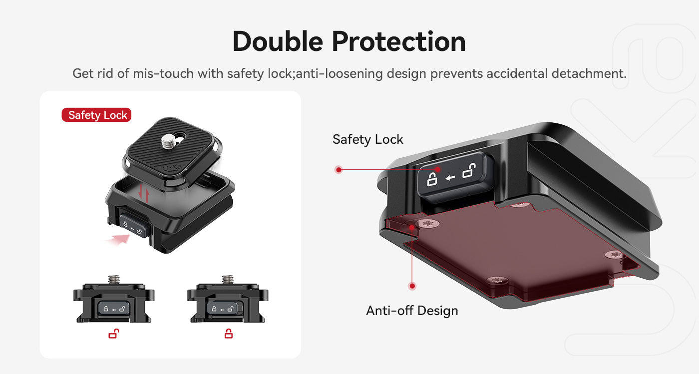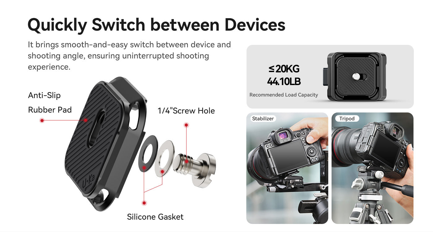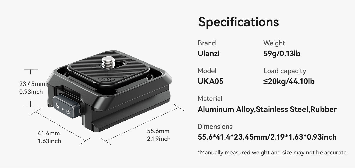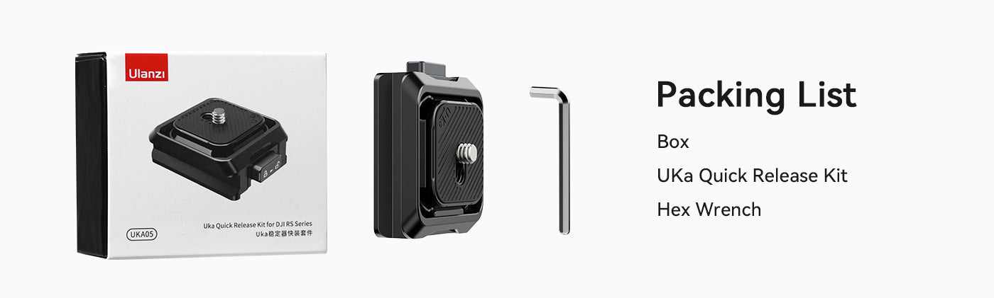 Das Ulanzi UKA05 Uka Quick Release Kit für DJI RS2/3/4 ist das ultimative Upgrade für eine schnelle und sichere Kamerabefestigung. Es ist mit Arca-Swiss, Uka und F38 kompatibel und bietet eine Ein-Schritt-Installation, rutschfeste Gummipads und eine Sicherheitsverriegelung, um ein versehentliches Lösen zu verhindern. Dank seiner kompakten Bauweise und dem Design mit Lanyard-Vorrichtung ist es ideal für kreative Menschen, die viel unterwegs sind, und ein Muss für Nutzer von DJI RS-Gimbals.