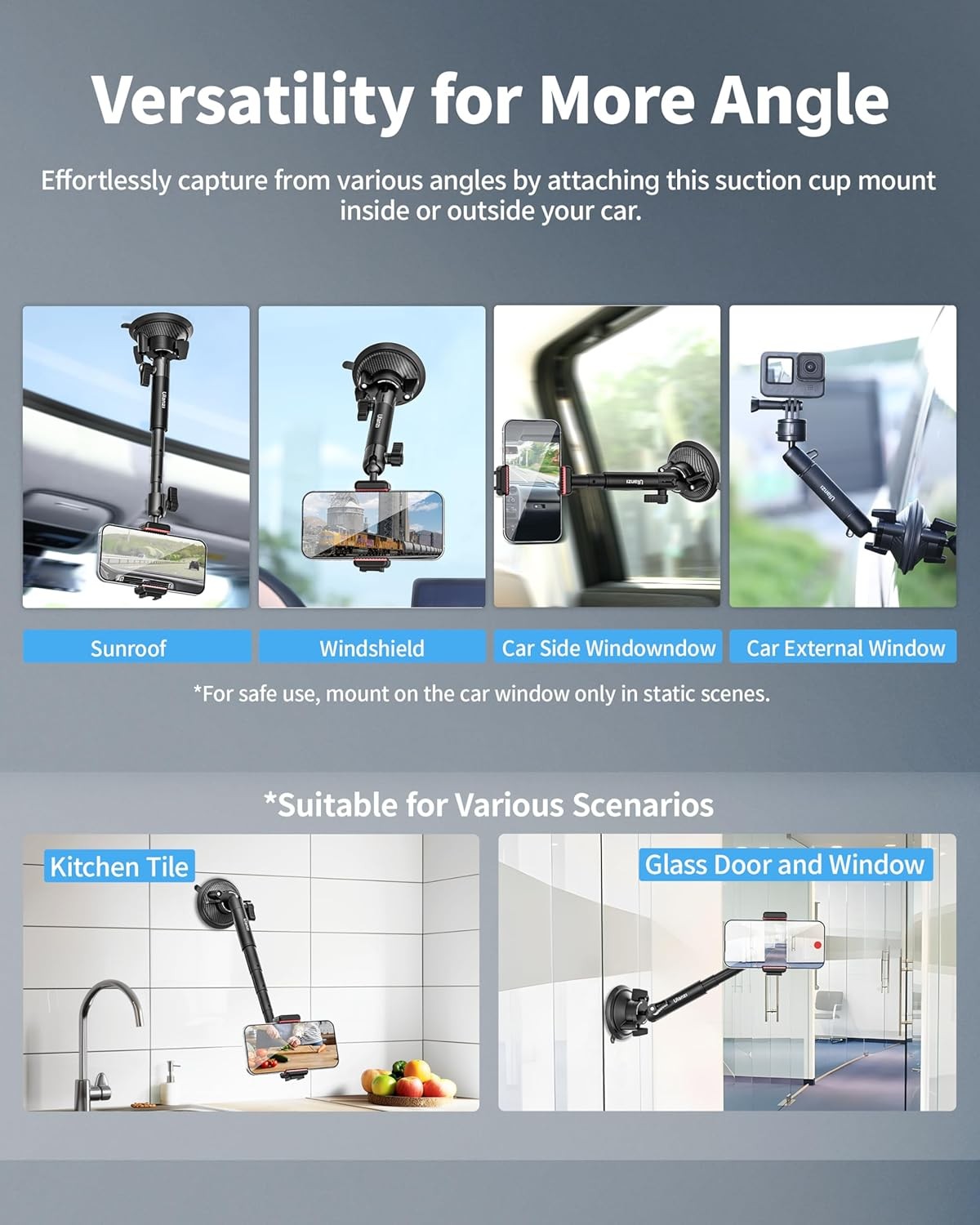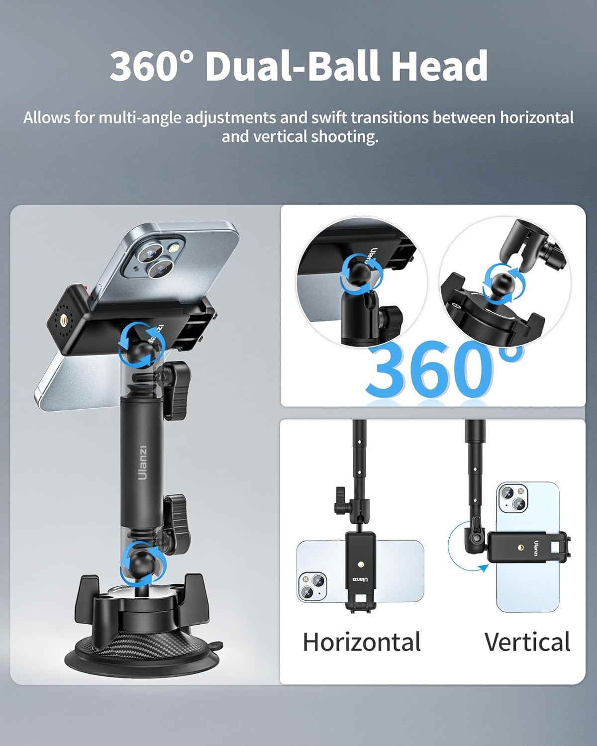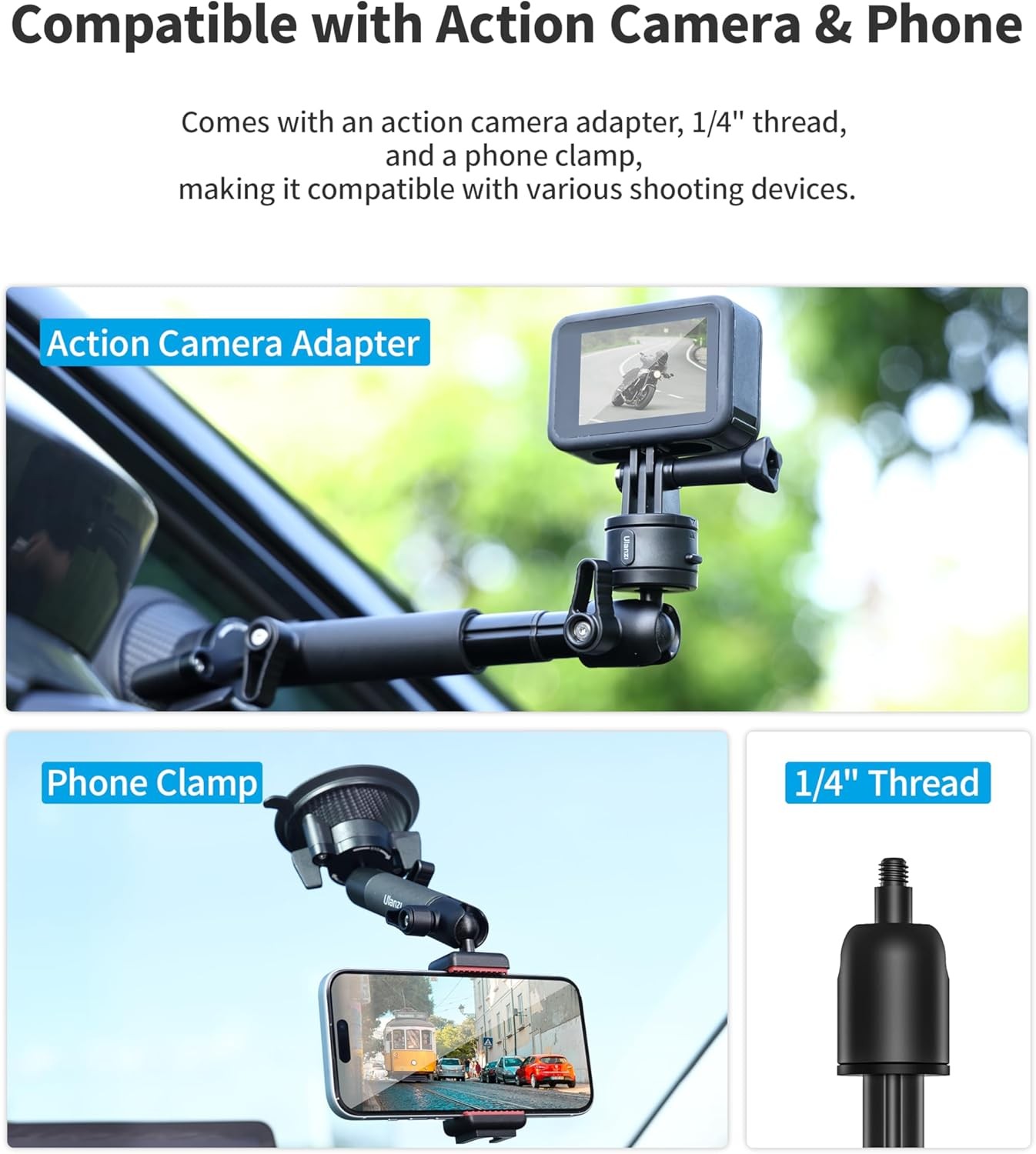 Der Teleskoparm der Halterung umfasst vier ausziehbare Stangen, die eine Verstellung um bis zu 13 cm ermöglichen, um unabhängig von der Oberflächenplatzierung die perfekte Perspektive zu erzielen. Die ZJ01 ist ideal für POV-Videos, die Befestigung an Fahrzeugen, Desktop-Setups oder flexible Aufnahmen im Innen- und Außenbereich und kombiniert Stabilität, Vielseitigkeit und Komfort für Content-Ersteller, die viel unterwegs sind.