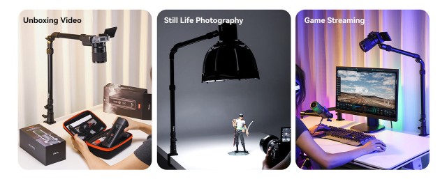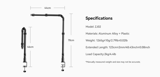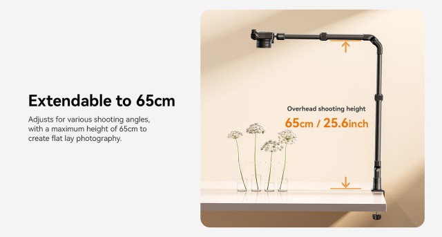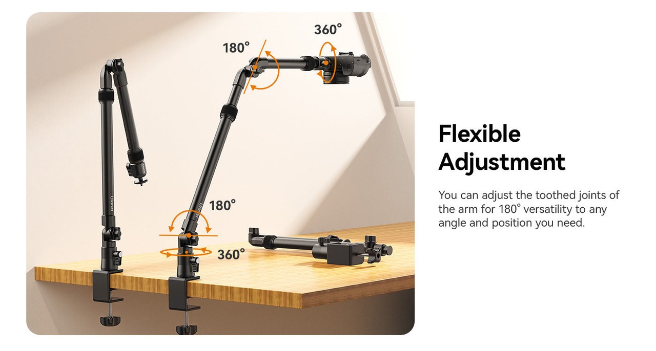 Die Ulanzi ZJ02 C-Clip-Klapphalterung ist eine vielseitige Tischhalterung aus Aluminium mit einem flexiblen Haltearm, die sich perfekt für Flat-Lay-Fotografie, Streaming oder Aufnahmen von oben eignet. Sie ist bis zu 65 cm in der Höhe und 123 cm in der Länge verstellbar und hält Geräte mit einem Gewicht von bis zu 2 kg sicher mit einer robusten C-Klemme.