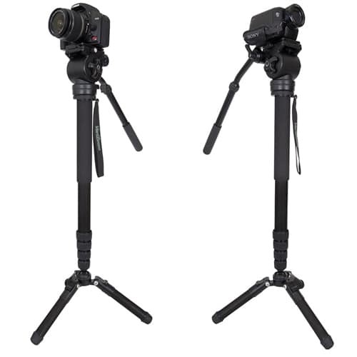 Im Lieferumfang enthalten ist ein flüssiger Schwenk-/Neigekopf für sanfte Kamerabewegungen, wodurch sich das System ideal für die Videoproduktion eignet. Das Einbeinstativ lässt sich von 26" bis 83" (6,9 ft) ausziehen und behält dank seiner Aluminiumkonstruktion und den hochwertigen Drehverschlüssen eine hervorragende Steifigkeit. Die klappbare Stativbasis lässt sich in drei Positionen arretieren, kann für den herkömmlichen Einbeinstativgebrauch entfernt werden und verfügt über verstellbare Gummifüße mit austauschbaren Spikes für Stabilität auf verschiedenen Oberflächen.