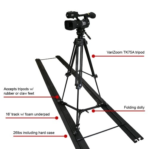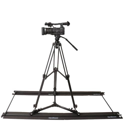 Die speziell entwickelten, gummibeschichteten Räder sorgen für einen völlig geräuschlosen Betrieb, während die mitgelieferte Unterlage aus hochdichtem Schaumstoff es ermöglicht, die Schiene auf praktisch jeder Oberfläche zu platzieren, einschließlich Gras, Kies, Teppich, Fliesen und Beton. Verstellbare Stativhalterungen ermöglichen den Betrieb in Bodennähe, auf Arbeitsplatten oder in voller Höhe von bis zu 67 Zoll mit dem mitgelieferten Stativsystem VZ-TK75A.