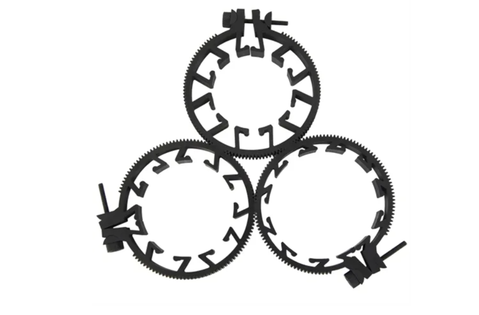 Das VariZoom VZDGS ist ein Klemmzahnradsatz für DSLR-Objektive mit einem Durchmesser von 60 bis 100 mm. Es ist sowohl mit manuellen als auch mit motorisierten Follow-Focus-Systemen kompatibel und ermöglicht eine reibungslose, präzise Steuerung für professionelle Video- und Kinoanwendungen.