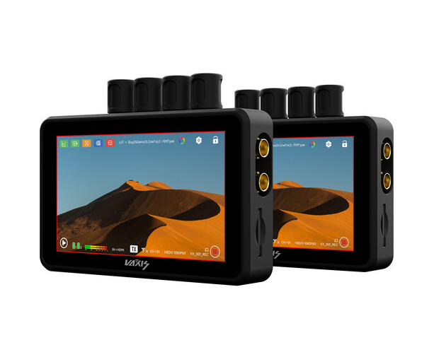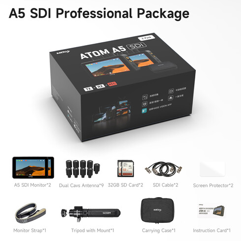 Das Vaxis Atom A5 SDI Monitor Professional Package bietet eine komplette drahtlose Videolösung mit zwei 5,5-Zoll-Touchscreen-TX/RX-Monitoren (1920 x 1080), die jeweils eine Helligkeit von 2000 cd/m² bieten, SDI/HDMI-I/O mit Loop-Ausgängen, eine Übertragungsreichweite von 1000 Fuß, MP4-Aufzeichnung auf microSD, zwei L500-Akkuplatten und CINE OS-Tools einschließlich 3D-LUTs und Scopes. Im Lieferumfang enthalten sind neun Antennen, zwei 32-GB-SD-Karten, zwei SDI-Kabel, Displayschutzfolien, ein Monitorriemen, ein ausziehbares Stativ mit Halterung und eine schützende Tragetasche.