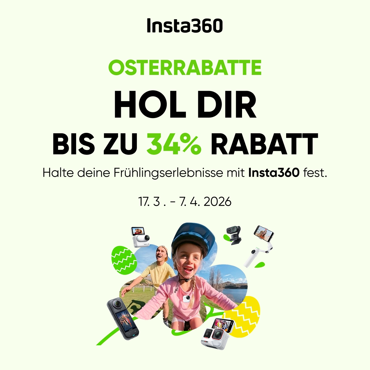 Ostern steht vor der Tür und mit ihm eine Sonderaktion für Insta360-Produkte. Vom 17. März bis zum 7. April 2026 profitieren Sie von attraktiven Rabatten von bis zu 34 % auf ausgewählte Produkte – von Action-Kameras einschließlich 360°-Modellen über mobile Stabilisatoren bis hin zu innovativen 360°-Drohnen und weiterem Zubehör.