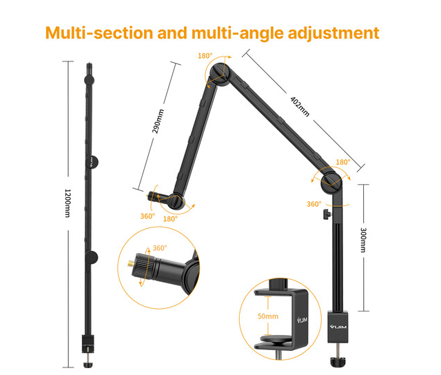 Der VIJIM LS24 Multifunktions-Tischarm wurde für Content-Ersteller, Podcaster und Streamer entwickelt, die eine stabile und flexible Befestigungslösung für Mikrofone, Kameras, Smartphones, GoPros oder LED-Leuchten benötigen. Seine robuste C-Klemme lässt sich sicher an Tischplatten mit einer Dicke von bis zu 5 cm befestigen, während das doppelte interne Federsystem für sanfte, geräuschlose Verstellungen sorgt und die befestigten Geräte vibrationsfrei stabil hält. Der Arm verfügt über ein dreiteiliges, verstellbares Design mit einem 360°-Kardanring an der Spitze für präzise Positionierung und ermöglicht eine Vielzahl von Winkeln für Streaming, Aufnahmen oder Filmaufnahmen. Der aus einer Aluminiumlegierung gefertigte LS24 trägt Geräte mit einem Gewicht von bis zu 1,5 kg und enthält Adapter für 1/4"-20-, 3/8"-16- und 5/8"-27-Gewinde sowie eine Handyhalterung für iPhone- und Android-Geräte (8,9–16,5 cm) und einen GoPro-Adapter für Actionkameras. Externe Kabelclips helfen bei der Kabelführung und sorgen für einen aufgeräumten, übersichtlichen Aufbau.