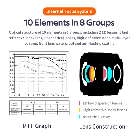 *optische Konstruktion mit 8 Gruppen und 10 Elementen, darunter 2 ED-Linsen, 1 Linse mit hohem Brechungsindex und 2 asphärische Linsen
