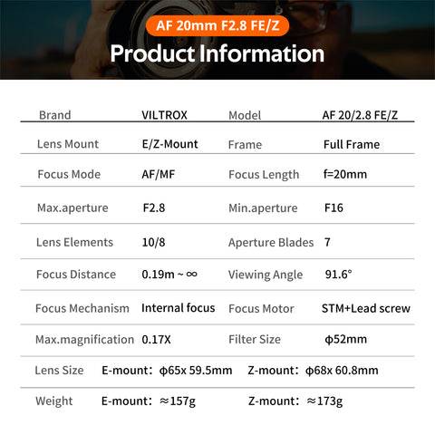 Das Viltrox AF 20 / 2,8 FE ist ein Autofokus-Objektiv für Sony E-Mount/Nikon Z-Mount-Kameramodelle. Mit 10 Elementen in 8 Gruppen bietet es eine hervorragende optische Leistung. Der minimale Fokusabstand von 0,19 m ermöglicht schöne Nahaufnahmen. Und der geräuscharme STM-Fokusmotor kann die Bewegungsposition präzise steuern und sorgt für eine genaue und gleichmäßige Fokussierung. Eine gute Wahl für Porträt-, Landschafts-, Nah- und Vlog-Aufnahmen!