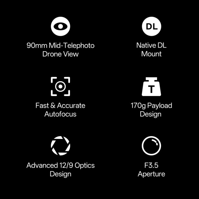 Natives DL-Mount Das AF 90mm F3.5 ist mit einem nativen DL-Mount ausgestattet und nahtlos mit der X9-8K Air Gimbal-Kamera des Inspire 3 kompatibel und bietet eine leistungsstarke neue mittlere Teleobjektiv-Option für Luftaufnahmen.