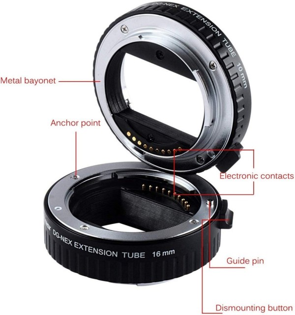 Hochwertiges automatisches Makro-Zwischenring-Set ermöglicht eine engere Fokussierung für vergrößerte Motive in der Makrofotografie. Verwandelt jedes Objektiv zu einem Bruchteil der Kosten in ein Makroobjektiv mit der ursprünglichen optischen Qualität. DG-Zwischenringe schaffen Abstand zwischen Objektiv und Filmebene, was eine engere Fokussierung erzwingt.