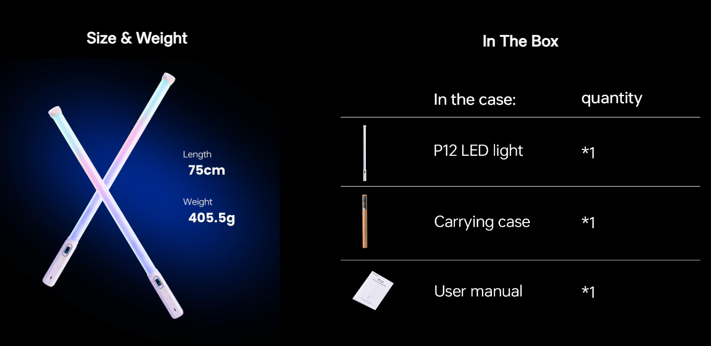 Ausgestattet mit 144 hochwertigen LEDs und einem CRI-Wert von RA≥95 sorgt der P12 für eine helle, gleichmäßige Ausleuchtung mit präziser Farbwiedergabe. Seine volle RGB-Fähigkeit bietet Zugriff auf 36.000 Farben mit präziser Steuerung von Farbton, Sättigung und Helligkeit, während der einstellbare Farbtemperaturbereich von 2500K bis 8500K eine einfache Anpassung an jede Beleuchtungsumgebung ermöglicht.