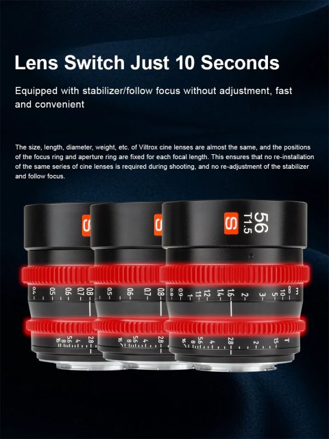 Viltrox Film-MFT-Objektive bieten eine einheitliche Größe/Gewicht/Gewicht/Kontrolle für eine einfache Austauschbarkeit innerhalb von Kamera-Rigs. Sie verfügen außerdem über eine sehr gute T/1,5-Blende, gezahnte Blenden-/Fokussierringe, hervorragende Schärfe, minimale Atmung, geringe Verzeichnung und chromatische Aberration, eine Nanobeschichtung zur Minimierung von Streulicht, eine Blende mit 14 Lamellen und eine robuste Metallkonstruktion...