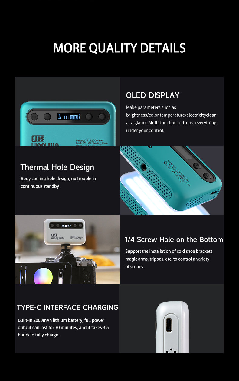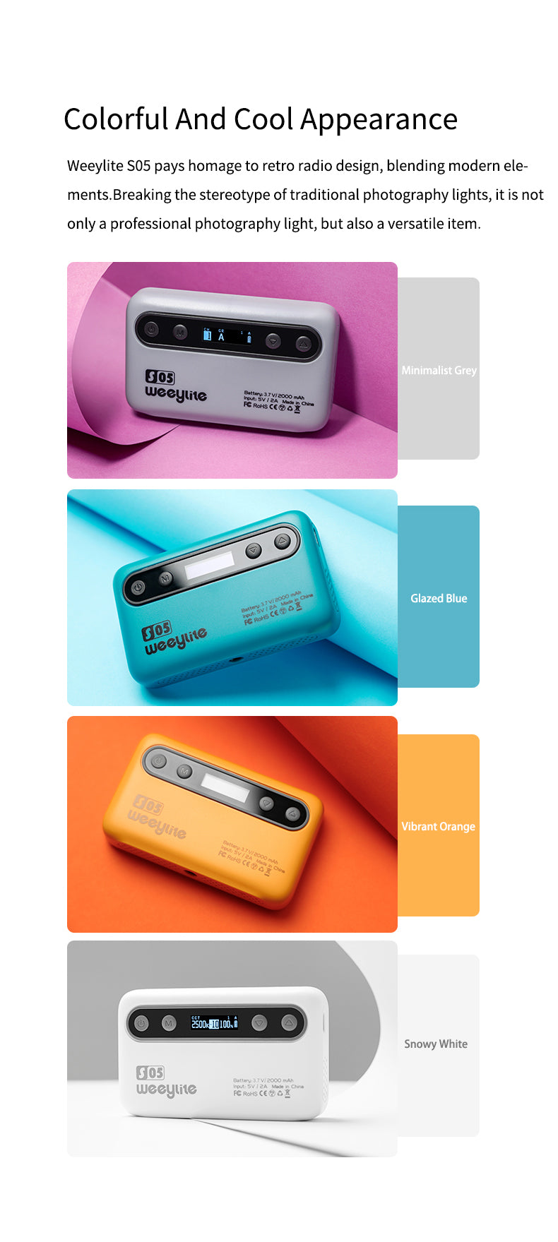 Weeylite S05 füllen Licht ist einportable Tasche füllen light.there sind mehrere hohe Farbe (positive weiß + warmweiß) und hochwertige RGB-Licht Perlen. Es hat die Vorteile der niedrigen eneregy Verbrauch, stabile Farbtemperatur, Energie und Strom sparen, lange Lebensdauer, kompakte Größe und bequeme carrying.it kann in verschiedenen Szenen angenommen werden und perfekt in der Fotografie, Video, Vlog Aufnahme, Live-Übertragung und so weiter verwendet.