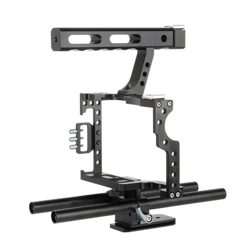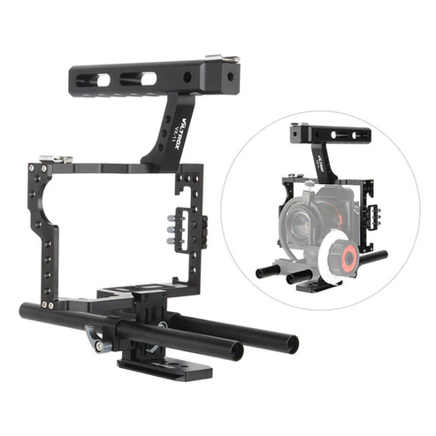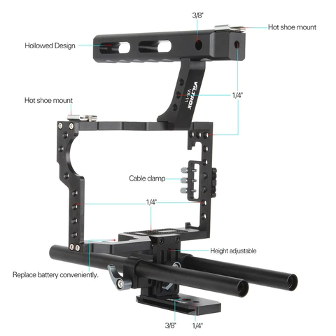 Der VX-11 Videokäfig aus Aluminiumlegierung ist eine gute Wahl, um Ihre Aufnahmen perfekter und einfacher zu machen. Es hat Dutzende von Standard 1/4 "& 3/8" Schraubenlöcher und 2 Blitzschuh Halterungen, helfen Ihnen, Video-Zubehör leicht zu platzieren! Entfesseln Sie Ihre Kreativität.