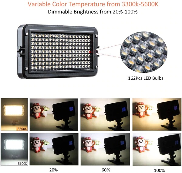 Dimmbare und Farbmodi Funktion: Helligkeitsdimmer (20%-100%) und variable Farbtemperatur (3300K-5600K) zur Aufhellung Ihrer Videos oder Bilder. Die 4 mitgelieferten Filter sind einfach über Magnet für kreative verschiedene Lichtfarben Effekte zu installieren.