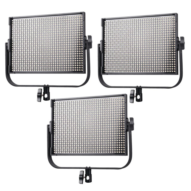 Set aus drei Leuchten Viltrox VL-D60T. 60W Bi-color LED-Licht mit einstellbarer Farbtemperatur (im Bereich 3300-5600K) und Intensität (20-100%; max. 6324 lm, 4350 lx/1 m). Es bietet die Möglichkeit der drahtlosen Fernbedienung (2,4 GHz, Fernbedienung im Lieferumfang enthalten) und die Möglichkeit der Stromversorgung durch Batterien (V-Mount, Batterie nicht enthalten) oder externe Stromversorgung (im Lieferumfang enthalten). Die Parametereinstellung wird durch das leicht ablesbare LCD-Display erleichtert. Abmessungen 320x345x58 mm, Gewicht 1900 g.