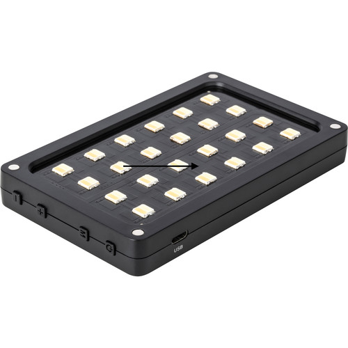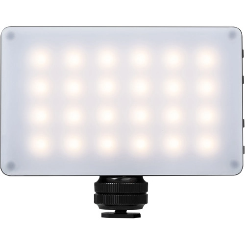 Kamera-LED-Leuchte mit 24 zweifarbigen LEDs mit einem Farbtemperaturbereich von 2.500-8.500 K und integriertem Akku (aufladbar über Micro-USB-Schnittstelle; Leuchte kann während des Ladevorgangs nicht verwendet werden; Akkulaufzeit ca. 1,2 h bei 100% Intensität und einer Farbtemperatur von 5.600 K). Integriertes OLED-Display zeigt Farbtemperatur, Helligkeit (regelbar von 10-100% ohne Flackern) und Akkustatus an. Das 1/4"-20 Gewinde sowie das mitgelieferte Reduzierstück für die Blitzbuchse und der mitgelieferte Diffusor sind natürlich auch dabei.