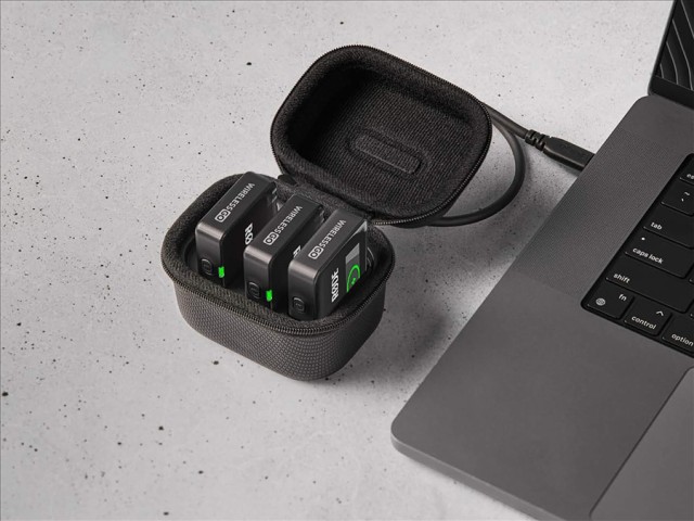 Dank des integrierten Akkus kann Ihr Wireless-Set gleichzeitig aufgeladen werden. Es ermöglicht bis zu zwei vollständige Aufladungen des Dreiteil-Sets, sodass Ihr Wireless Go Dreiteil-Set bis zu 21 Stunden lang betrieben werden kann. Über den USB-C-Anschluss haben Sie auch Zugriff auf die Daten des gesamten Systems, um Aufnahmen zu übertragen, Einstellungen zu ändern und die Firmware des Wireless-Sets zu aktualisieren.