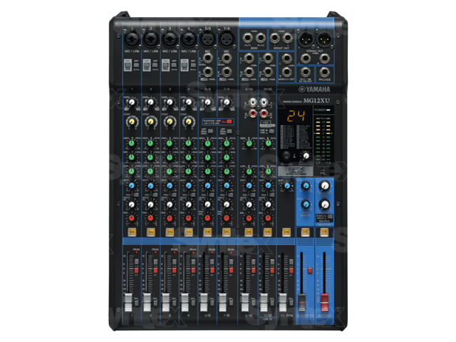Jeder Kanal des MG12XU hat einen eigenen FX-Bus-Send-Pegel, und es stehen 24 voreingestellte Effekte zur Auswahl. Der Gesamtpegel des FX-Busses wird über einen speziellen FX-Return-Pegelregler gesteuert. Diese Effekte, die Hall, Delay, Phaser, Flanger, Chorus, Tremolo, Auto-Wah, Distortion und mehr bieten, können verwendet werden, um Gesang und Instrumente besser im Mix unterzubringen.