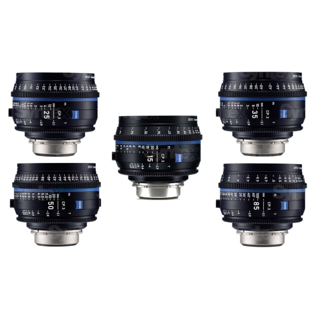 Preisreduziertes Set von fünf ZEISS CP.3 Objektiven (CP.3 15/2.9, CP.3 25/2.1, CP.3 35/2.1, CP.3 50/2.1/ und CP.3 85/2.1)