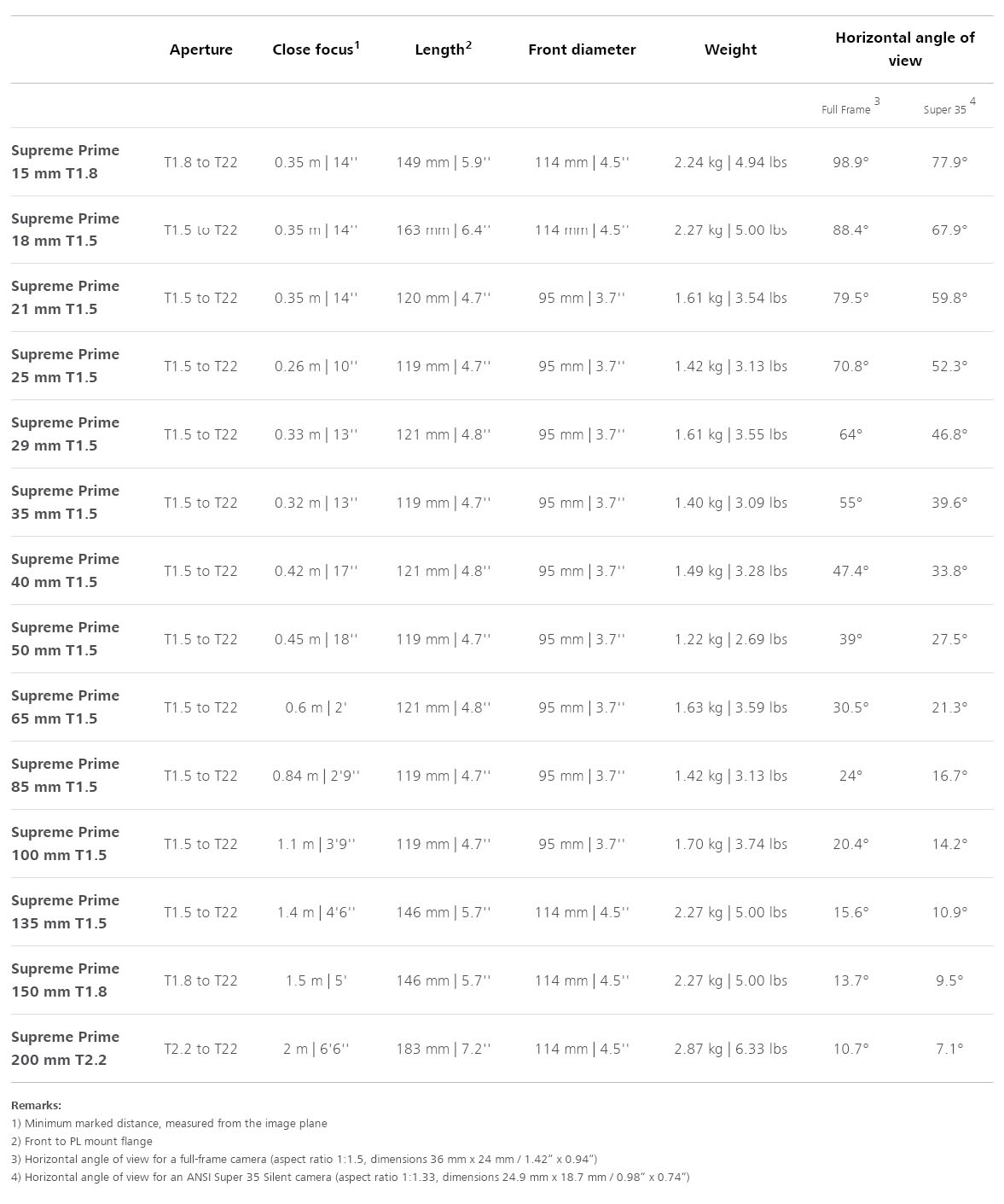 Die ZEISS Supreme Prime Reihe von High-End-Filmobjektiven bietet maximale Konsistenz über alle Modelle hinweg: einheitliche Sensorabdeckung, Farbe, Lichtstärke (T1,5 bei den meisten Modellen), Größe, Gewicht und Platzierung der Bedienelemente. Alle Objektive der Serie decken FF-Sensoren (46,2 mm zirkuläre Projektion) zuverlässig ab, unterstützen die eXtended Data-Technologie und sind - dank des "Interchangeable Mount System" - mit PL-, LPL- und EF-Bajonetten kompatibel (Objektive sind standardmäßig mit PL-Bajonett und metrischen Markierungen versehen).