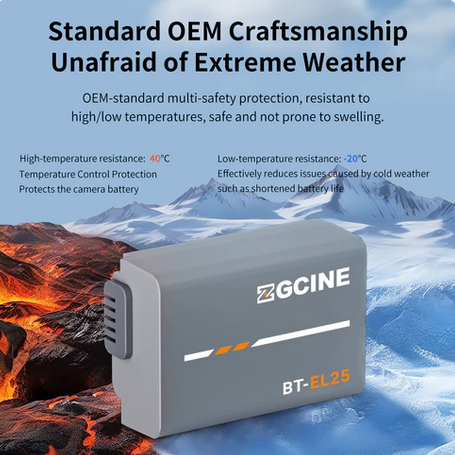 Der ZGCINE BT-EL25 ist ein vollständig entschlüsselter 1280-mAh-Ersatzakku (7,7 V) von einem Drittanbieter für Nikon Z30-, Z50- und Zfc, der in Größe und Leistung dem Original EN-EL25 entspricht – keine Warnmeldungen, vollständige Kamerakommunikation – und gleichzeitig ultraschnelles Laden (vollständige Aufladung in ~2 Stunden mit ZGCINE PS/PC-Ladegeräten) unterstützt und über einen hochwertigen 8-stufigen Sicherheitsschutz verfügt.