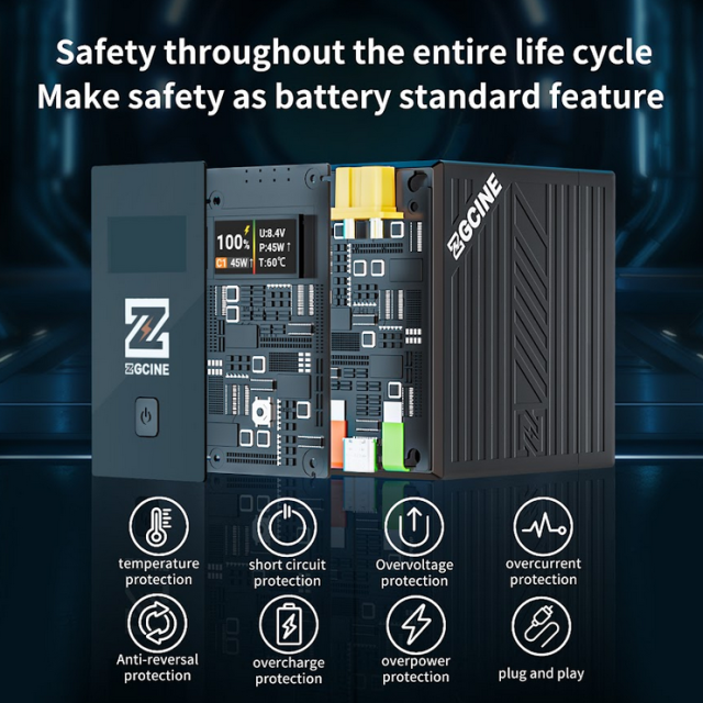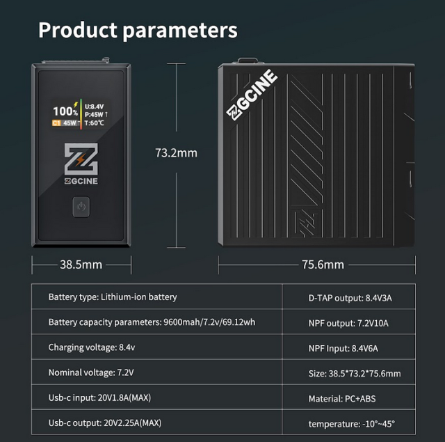 Der Akku ZGCINE BT-NPF970 der L-Serie bietet hohe Leistung in einer robusten, kompakten Form mit einer Lithium-Ionen-Kapazität von 9600 mAh (7,2 V/69,12 Wh) und unterstützt PD-Schnellladung und -Entladung mit bis zu 36 W über USB-C. Ausgestattet mit einem D-TAP-Ausgang (8,4 V/3 A), einem NPF-Ausgang (7,2 V/10 A) und einem NPF-Eingang (8,4 V/6 A) versorgt sie eine Vielzahl von Kino- und Rundfunkgeräten mit Strom. Der integrierte OLED-Bildschirm ermöglicht die Echtzeitüberwachung des Batteriestands, der Spannung (U), der Leistung (P), der Temperatur (T) und des C1-Schnittstellenstatus. Mit einer einzigen Taste kann die Anzeige umgeschaltet werden (während des Ladevorgangs inaktiv). Das Gerät wurde für Sicherheit während seiner gesamten Lebensdauer entwickelt und verfügt über Schutzvorrichtungen gegen Überhitzung, Kurzschluss, Überspannung, Überstrom, Verpolung, Überladung und Überlastung. Es besteht aus PC+ABS, arbeitet zuverlässig bei Temperaturen von -10 °C bis 45 °C und verfügt über Plug-and-Play-Funktionalität für die nahtlose Integration in professionelle Arbeitsabläufe.