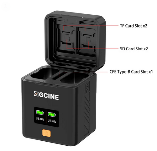 Der ZGCINE Ladekoffer für Nikon EN-EL15c-Akkus wurde entwickelt, um eine effiziente und tragbare Ladelösung für Nikon EN-EL15c-Akkus zu bieten. Es unterstützt den USB-C-PD-Eingang für schnelles Laden und bietet einen USB-C-PD-Ausgang für die gleichzeitige Stromversorgung von zwei Geräten mit einer Ausgangsleistung von 8,4 V/1 A an jedem Anschluss. Das Gehäuse ist mit mehreren Kartensteckplätzen ausgestattet, darunter 2 SD-Kartensteckplätze, 2 TF-Kartensteckplätze und 1 CFE Typ-B-Kartensteckplatz, was es zu einem idealen Zubehör für Fotografen und Videofilmer macht, die sowohl Strom als auch Datenspeicherlösungen benötigen.