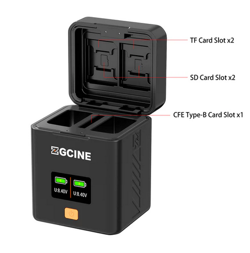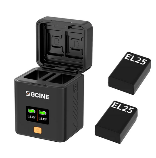 Das ZGCINE-Ladeetui für Nikon EN-EL25-Akkus bietet einen USB-C-PD-Eingang/-Ausgang, mehrere Kartensteckplätze und einen übersichtlichen OLED-Bildschirm für eine effiziente Akku- und Medienverwaltung.