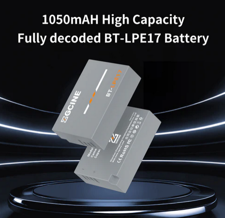Der ZGCINE BT-LPE17 ist ein vollständig decodierter 1030-mAh-Ersatzakku (7,2 V) von einem Drittanbieter für Canon-Kameras, der in Größe und Funktionalität dem Original-LP-E17 perfekt entspricht – keine Pop-ups, vollständige Kamerakommunikation – und gleichzeitig ultraschnelles Laden (vollständige Aufladung in nur ~1,8…