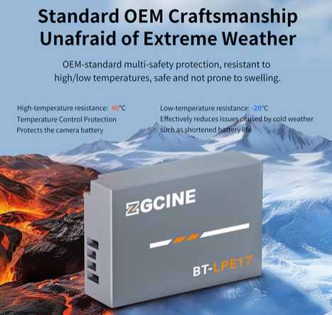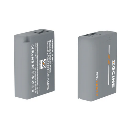 Der ZGCINE BT-LPE17 ist ein vollständig decodierter 1030-mAh-Ersatzakku (7,2 V) von einem Drittanbieter für Canon-Kameras, der in Größe und Funktionalität dem Original-LP-E17 perfekt entspricht – keine Pop-ups, vollständige Kamerakommunikation – und gleichzeitig ultraschnelles Laden (vollständige Aufladung in nur ~1,8 Stunden mit ZGCINE PS/PC-Ladegeräten) und erstklassigen 8-stufigen Sicherheitsschutz bietet.