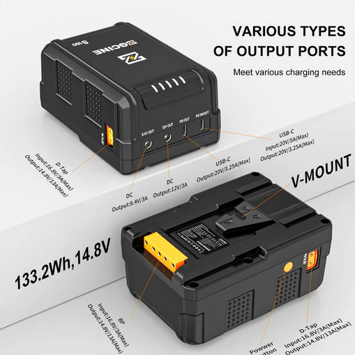 Die ZGCINE V-Mount Battery 16.8V 150Wh ist eine leistungsstarke Stromversorgungslösung mit zwei USB-C PD-, zwei D-Tap- und zwei DC-Ausgängen, die sich ideal für professionelle Video- und Fotoausrüstung eignet.