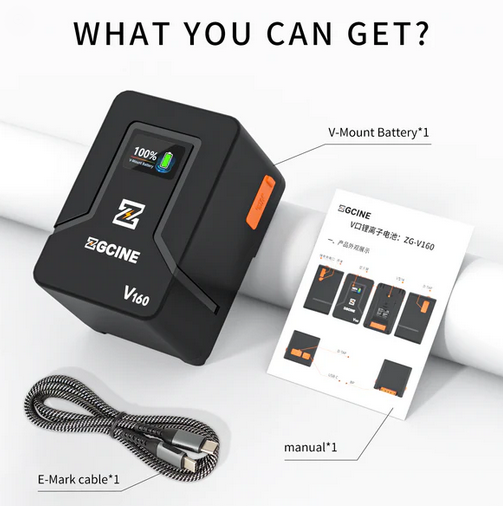 Der ZGCINE V-Mount-Akku 16,8V 160WH bietet eine hohe Kapazität und schnelle Ladeleistung mit USB-C PD-Eingang/Ausgang und echten Samsung-Akkuzellen. Ideal für anspruchsvolle Videoproduktionsgeräte.