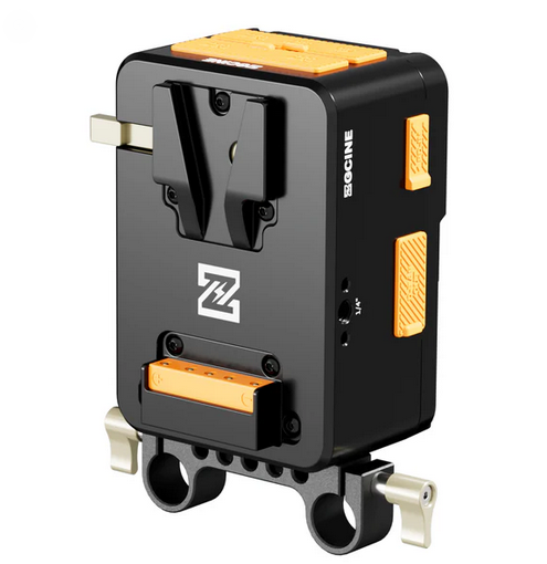 Die ZGCINE VM-HS1 HotSwap-Platte in Orange ist eine interne V-Mount-Platte mit Hot-Swap-Funktion für die kontinuierliche Stromversorgung professioneller Kameras. Sie verfügt über einen integrierten 50-Wh-Akku für nahtlose Übergänge, mehrere Ausgangsanschlüsse, darunter zwei USB-C-PD- und vier D-Tap-Anschlüsse, sowie ein 0,96-Zoll-IPS-Display mit Countdown-Erinnerung.