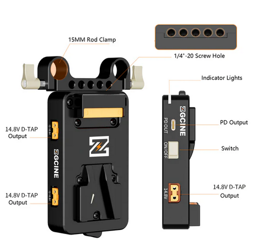 Die ZGCINE VM-VP3 ist eine kompakte V-Mount-Platte, die Ihre Kamera und Ihr Zubehör über einen einzigen V-Mount-Akku mit Strom versorgt. Sie verfügt über mehrere geregelte Ausgangsanschlüsse, darunter USB-C PD und drei D-Tap-Anschlüsse, sowie einen BPU-Anschluss für kompatible Kameras. Mit einer einfachen Ein-Tasten-Steuerung ist diese Platte ein vielseitiger und zuverlässiger Stromverteiler.