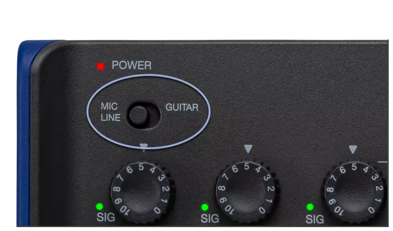 Hier können Sie den Mic/Line- oder Guitar (Hi-Z)-Modus für Eingang 1 aktivieren.