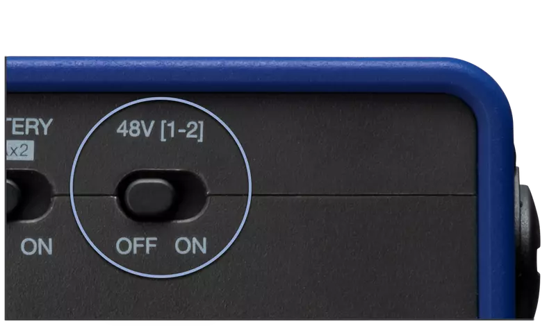 Hier können Sie die +48-V-Phantomspeisung für Kondensatormikrofone aktivieren.