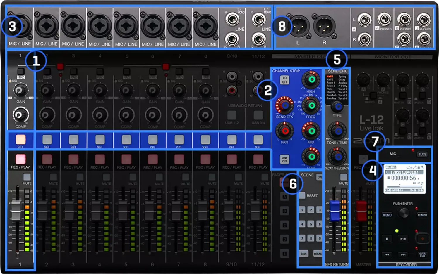 LiveTrak L-12 ist die einzige digitale Konsole, mit der Sie Live-Audio mischen, gleichzeitig bis zu zwölf Spuren aufnehmen und dazwischen sogar fünf unabhängige, frei konfigurierbare Kopfhörermischungen erstellen können. Endlich können Sie mit einem einzigen Gerät mischen, aufnehmen und abhören.